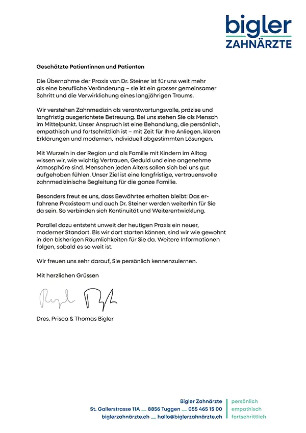 Nach 28 Jahren zahnärztlicher Tätigkeit in Tuggen ist für mich der Zeitpunkt gekommen, etwas kürzer zu treten. Ich freue mich sehr, dass ich Sie über eine wichtige Veränderung informieren darf. Mit Frau Dr. Prisca Bigler und Herr Dr. Thomas Bigler wird ab Mai 2026 ein engagiertes und fachlich hervorragend qualifiziertes Nachfolger-Ehepaar die Praxis gemeinsam weiterführen.